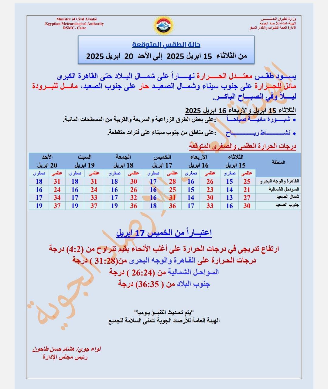 - القاهرة الكبرى: العظمى 25 درجة والصغرى 15 درجة مئوية.