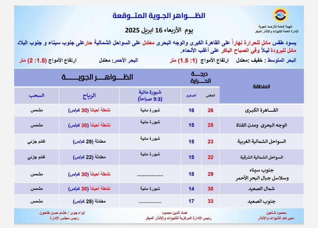 وقالت هيئة الأرصاد الجوية إن من المتوقع أن يحدث غدا الخميس 17 أبريل، ارتفاع تدريجي في درجات الحرارة على أغلب الأنحاء، ليسود طقس مائل للحرارة نهاراً على القاهرة الكبرى والوجه البحري، يكون معتدلا على السواحل الشمالية، حارا على جنوب سيناء وجنوب البلاد، مائلا للبرودة ليلاً وفي الصباح الباكر.