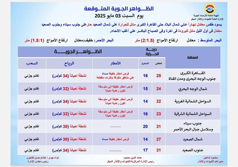 وقالت هيئة الأرصاد الجوية إن من المتوقع أن يسود غدا السبت، طقس معتدل الحرارة نهارا على شمال البلاد حتى القاهرة الكبرى، مائل للحرارة على شمال الصعيد.
