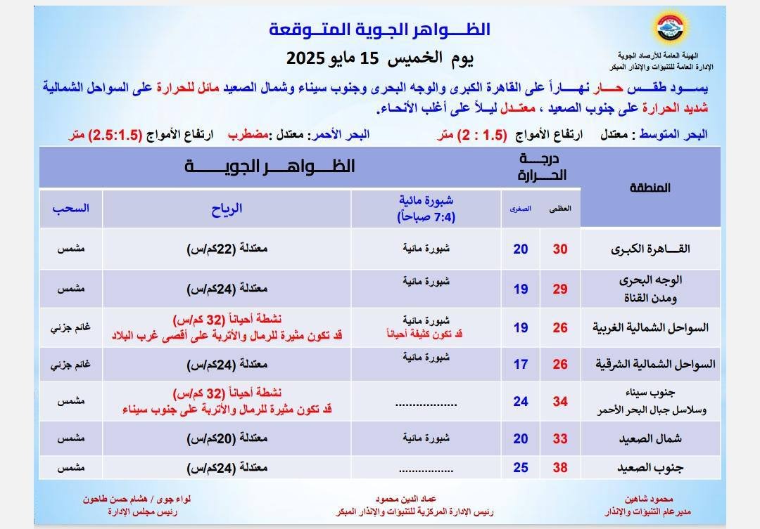 جنوب الصعيد: العظمى تسجل 38 درجة، والصغرى تسجل 25 درجة مئوية.