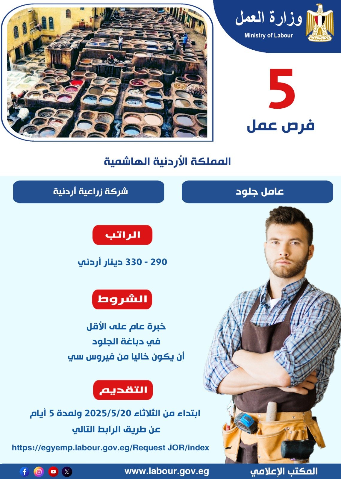 أعلنت وزارة العمل اليوم الثلاثاء، عن توفير 5 فرص عمل جديدة للمهتمين في مجال دباغة الجلود، وذلك في إحدى المؤسسات المتخصصة بالمملكة الأردنية الهاشمية.