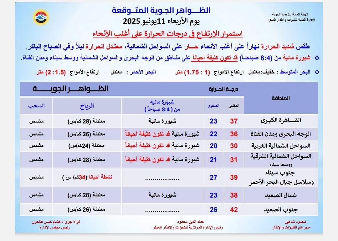 كما يستمر تكون الشبورة المائية خلال ساعات الصباح، قد تكون كثيفة أحياناً على مناطق من الوجه البحري والسواحل الشمالية ووسط سيناء ومدن القناة. مع نشاط رياح على مناطق من القاهرة الكبرى والوجه البحري والسواحل الشمالية وشمال الصعيد وجنوب سيناء خلال فترات متقطعة.