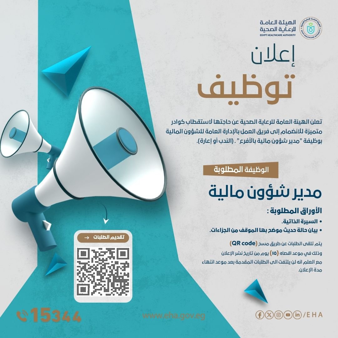 أعلنت الهيئة العامة للرعاية الصحية، التابعة لوزارة الصحة، عن توفر وظائف شاغرة، وذلك لحاجتها لاستقطاب كوادر متميزة للإنضمام إلى فريق العمل بإدارة الشؤون المالية، لشغل وظيفة، مدير شؤون مالية بالأفرع، (ندبًا أو إعارة)، وذلك بوضع عدة شروط لمن يريد التقديم على هذه الوظيفة.