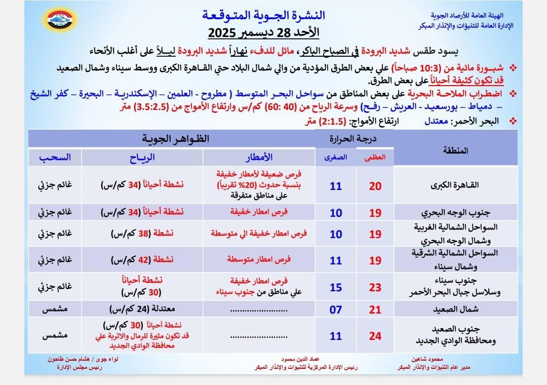 وأوضحت هيئة الأرصاد الجوية أن من المتوقع أن يسود طقس شديد البرودة في الصباح الباكر، مائل للدفء نهاراً شديد البرودة ليلاً على أغلب الأنحاء، وتستمر درجات الحرارة في الانخفاض لتصل إلى 11 درجة مئوية على القاهرة الكبرى، وتنخفض حتى 7 درجات على شمال الصعيد.