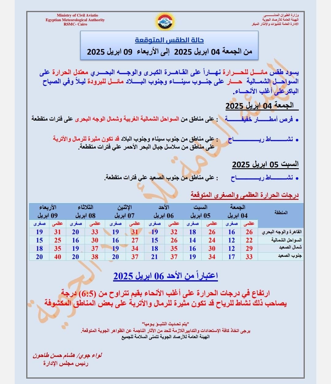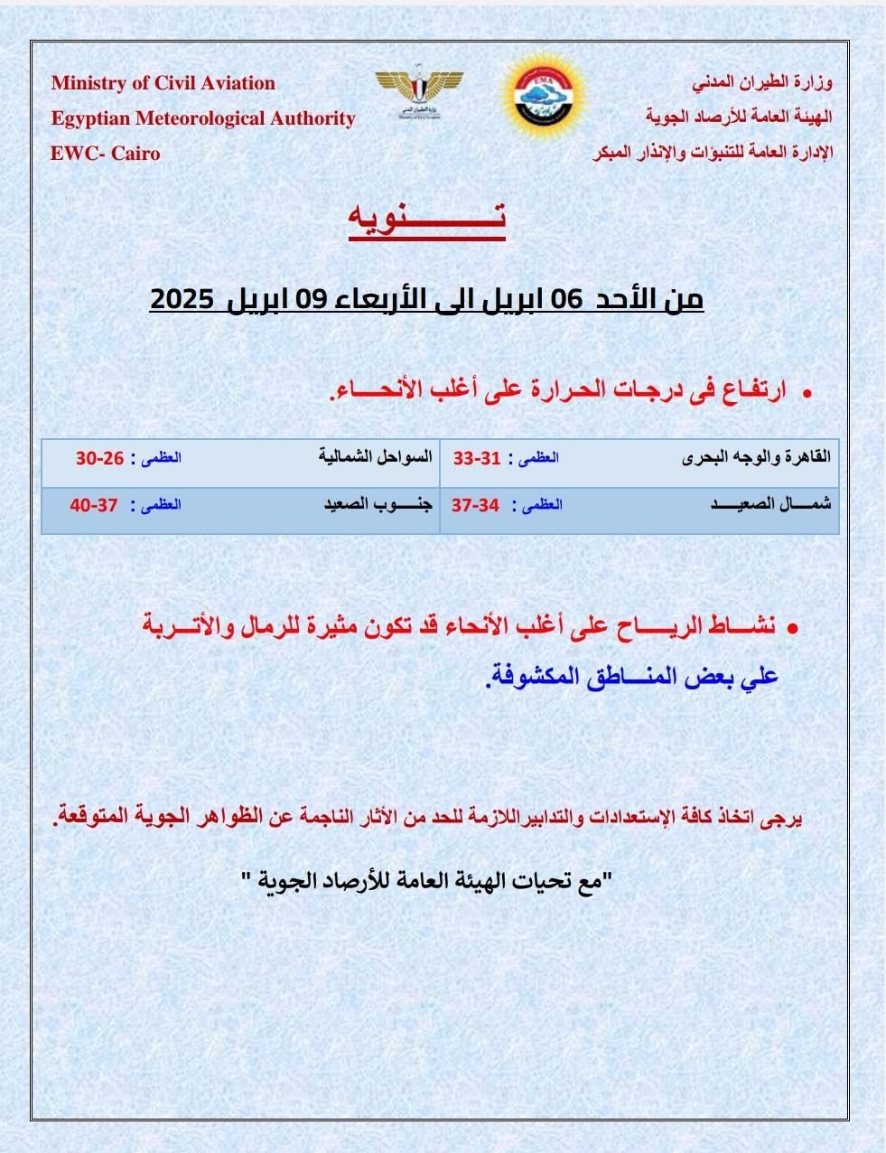 نوهت الأرصاد الجوية إلى أنّ بداية من يوم الأحد 6 إبريل إلى الأربعاء 9 إبريل، من المتوقع أن تزيد درجات الحرارة، وقد تصل في بعض المناطق مثل جنوب الصعيد إلى 40 درجة مئوية.