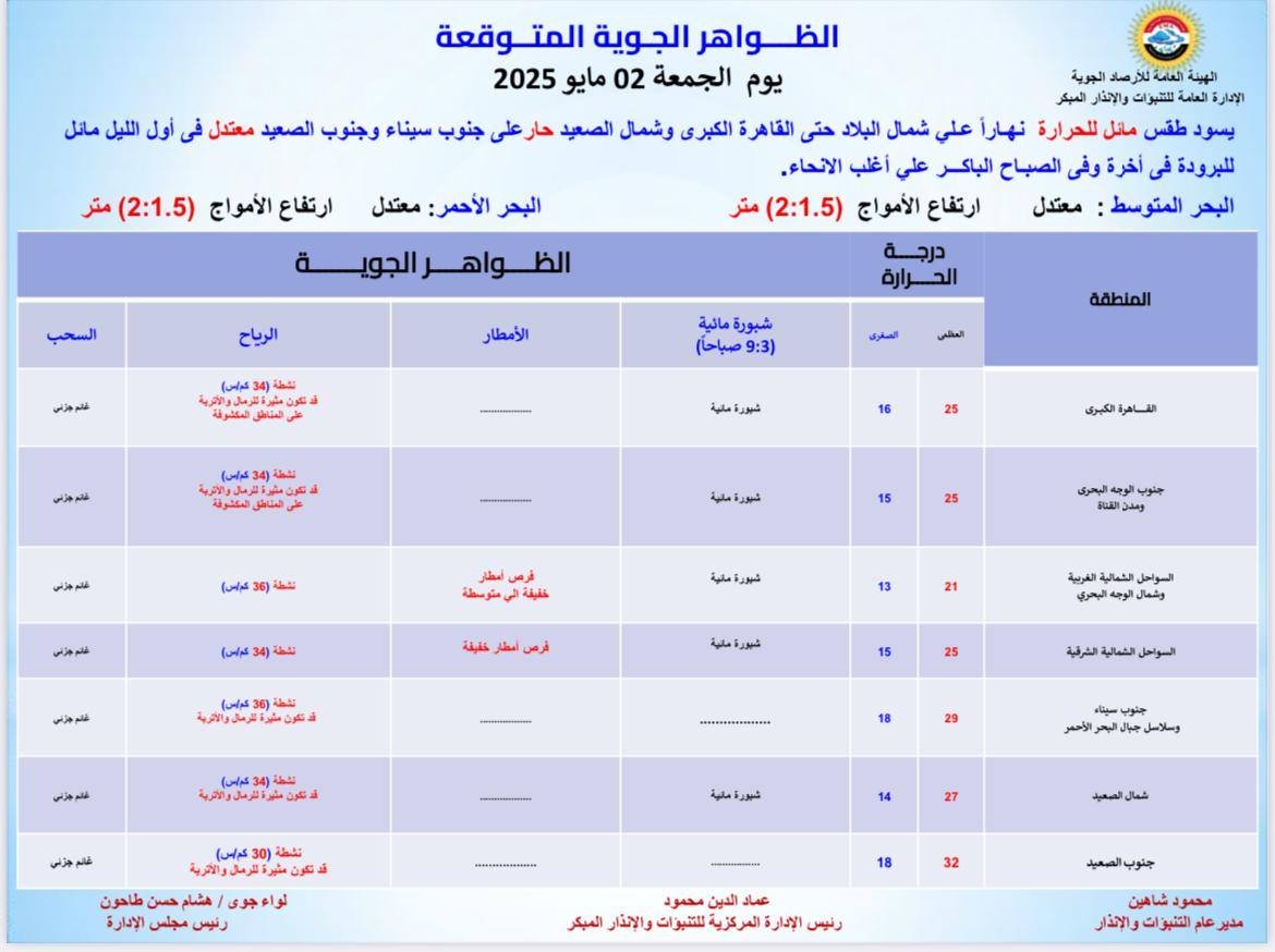 وأوضحت الأرصاد الجوية، أن من المتوقع أن يسود الجمعة، طقس مائل للحرارة نهارا على شمال البلاد حتى القاهرة الكبرى، بالإضافة إلى شمال الصعيد.