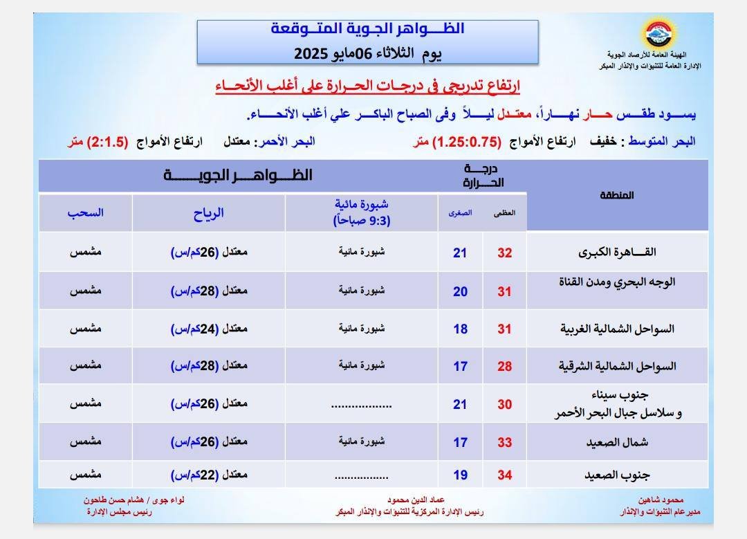 تسجل درجة الحرارة العظمى على القاهرة الكبرى 32 درجة، في حين تسجل الصغرى 21 درجة مئوية، مع تكون الشبورة المائية خلال الصباح الباكر على معظم الطرق السريعة، وبعض المناق الداخلية المفتوحة، وتكون حركة الرياح معتدلة بسرعة تصل إلى 26 كيلومترا في الساعة.